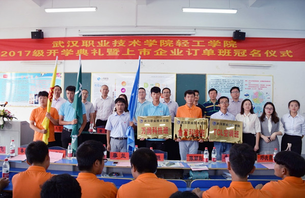 武职网讯(通讯员 叶莉 雷迪 摄影 李振峰)9月25日上午9时,一场由企业高管主持的开学典礼暨“订单班”冠名仪式在武汉职业技术学院科教园区举行,金发科技、万润科技和TCL空调三家上市企业的10余名高管,轻工学院全体领导、教师代表和2017级228名新生参加典礼。