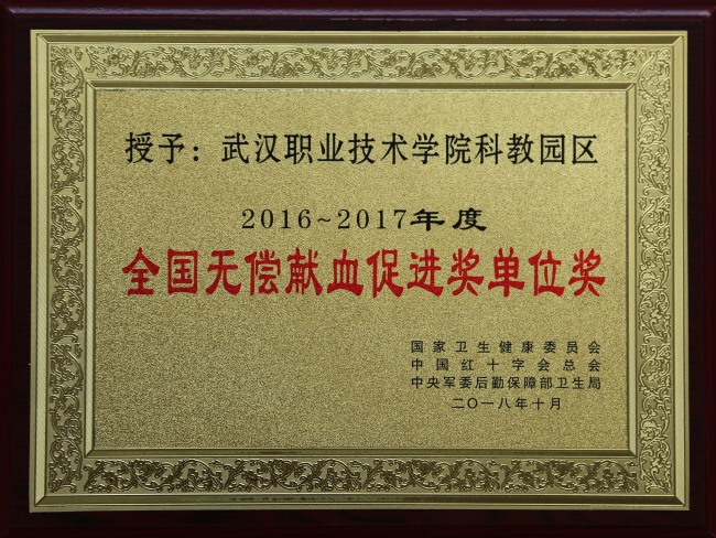武职网讯(通讯员 王清)近日,武汉职业技术学院科教园区荣获由国家卫生健康委员会、中国红十字会总会、中央军委后勤保障部卫生局联合授予的2016-2017年度“全国无偿献血促进奖单位奖”。