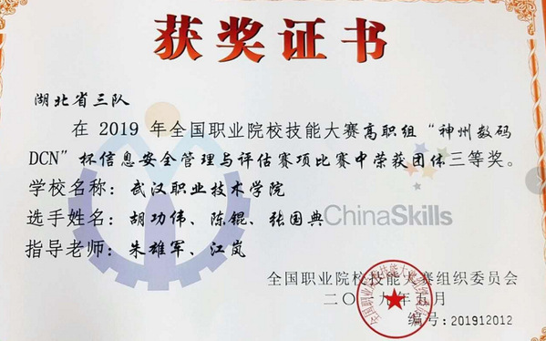 学院一贯重视高素质技术技能型人才的培养,60%以上的学生考取华为公司、红帽公司、麒麟软件公司HCIP、HCIE、RHCE等高水平职业资格证书,学院师生在国家级、省级技能大赛和世界技能大赛中屡获殊荣。在第45届、46届世界技能大赛网络安全赛项、网络布线、网站设计中获湖北省一等奖3项、二等奖6项。在全国职业院校技能大赛网络安全赛项中获全国三等奖。在全国NOC信息技术大赛中获全国一等奖1项,湖北省信息技术创新大赛中获一等奖1下,在第45届、46届世界技能大赛武汉市选拔赛中获一等奖5项、二等奖6项。获红帽Linux湖北省选拔赛一等奖1项。在一带一路金砖国家比赛中获网络安全、网站设计与开发赛项全国一等奖1项,二等奖2项。