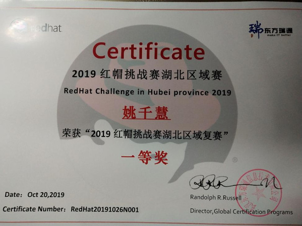 学生姚千慧在红帽挑战赛湖北区域赛中荣获一等奖
