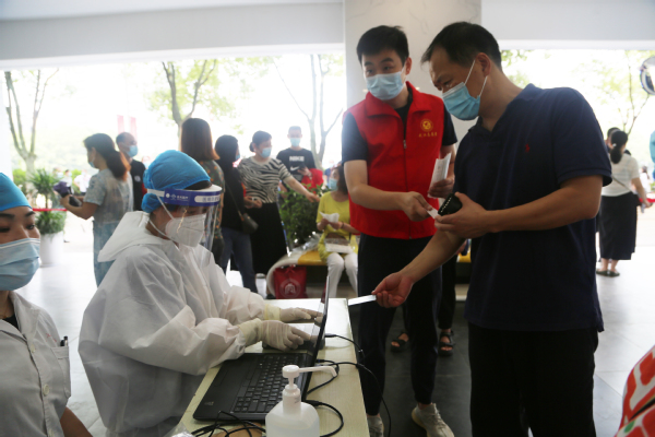 教职工在志愿者引领下登记个人信息