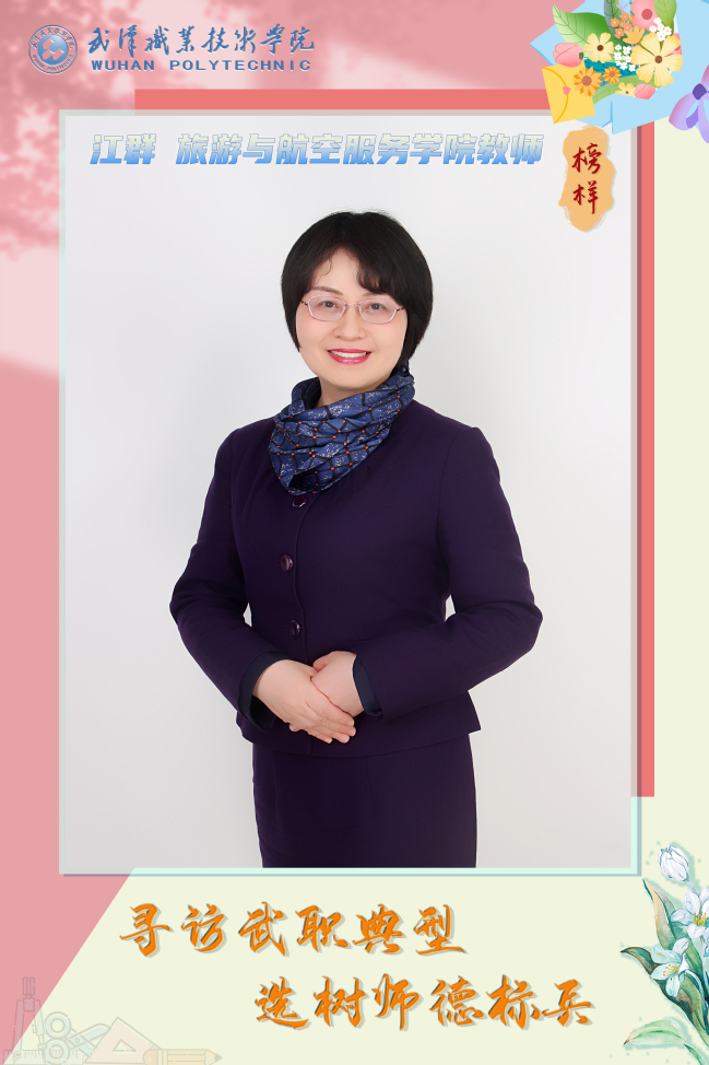 【个人简介】江群,中共党员,旅游与航空服务学院副教授,航空工业文化育人专指委委员,中国民用航空运输协会兼职教员,1+X空中乘务职业技能考评员。主持国家教学资源库《民航运输企业管理概论》课程建设。