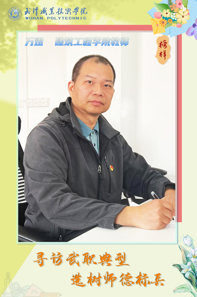 万煜从教二十余年,忠于党的教育事业,勤恳敬业,刻苦专研,与时俱进,创新求变,积极探索。他长期从事教研管理和建筑装饰工程技术专业教学工作,具有丰富的实践教学改革和社会科研经验。近五年多次被评为年度考核“优秀”和师德考核“优秀”。他为人宽厚,甘于奉献,团结同事,关爱学生,在教育教学和生活中一如既往地践行践学。
