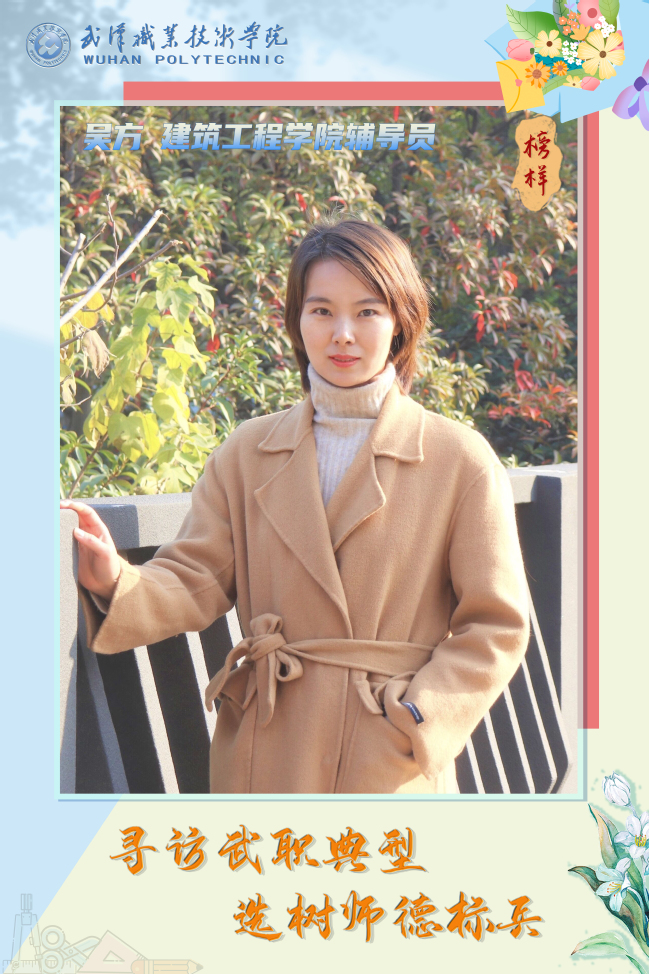 【个人简介】吴方,中共党员,讲师,建筑工程学院建工学生党支部书记,2017年1月至2023年3月任建筑工程学院专职辅导员。参与完成全国共青团科研课题1项,湖北省高校学生工作精品项目1项,校级科研项目1项,公开发表思想政治理论学科论文3篇。