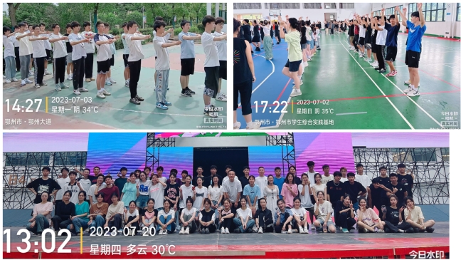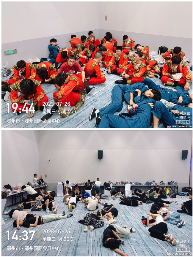 7月1日起,旅游学院师生每天早上7:00从学校出发,历经近两个小时车程从武汉奔赴鄂州,晚上近11:00回到学校。中途没有地方休息,志愿者们就席地而坐,累了就躺在排练的场地小睡一阵。学生们不仅训练刻苦,而且特别注意垃圾清理等细节,多次受到组委会表扬。